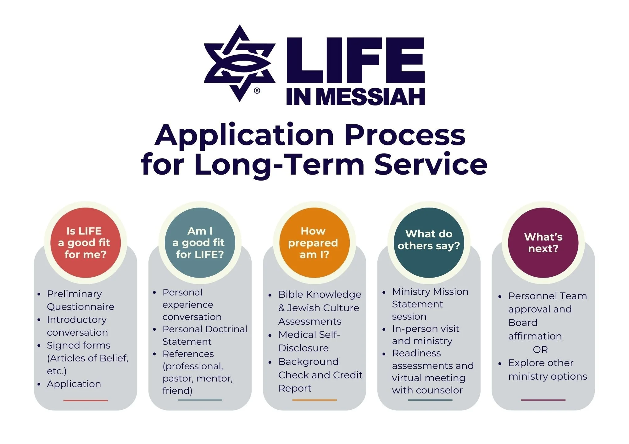 Shalom and welcome, Life in Messiah applicant! Thank you for your interest in serving the Lord with us! Please click and read the cover letter below, review the diagram for a visual of our application process, then proceed to step 1. We look forward to walking this journey with you.